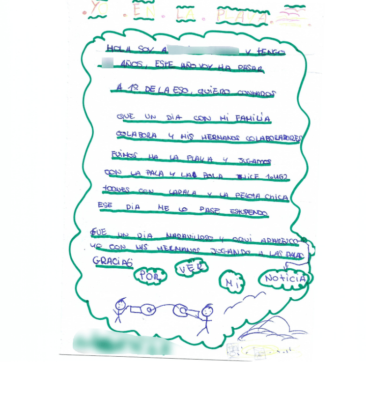 Este año voy a pasar a 1º de la ESO. Quiero contaros que un día con mi familia colaboradora y mis hermanos colaboradores. Fuimos a la playa y jugamos con la pala y la bola con la que hice 1462 toques con la pelota chica. Ese día me lo pasé estupendo.